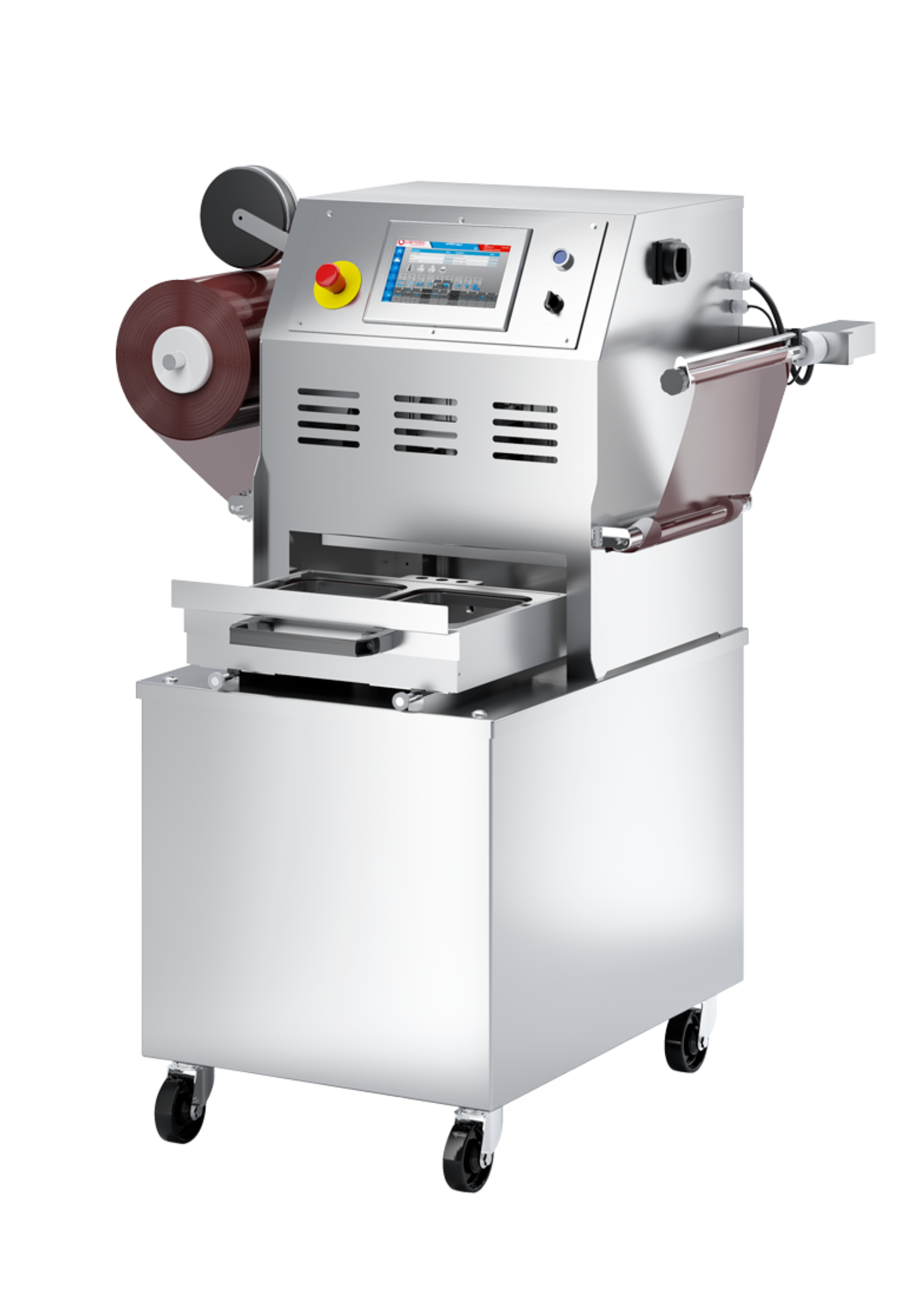Ημιαυτόματη μηχανή σφράγισης δίσκων mod. TDF 500 για μικρές εκροές παραγωγής, μόνο επιλογές συσκευασίας σφράγισης ή MAP.Ημιαυτόματη μηχανή σφράγισης δίσκων mod. TDF500 AE με περιστροφική μήτρα σετ τραπεζιού για αύξηση της παραγωγικότητας. Κατάλληλο για μικρή παραγωγή για τη συσκευασία υπό κενό, τροποποιημένη ατμόσφαιρα (MAP) ή SKIN με προκατασκευασμένους δίσκους.